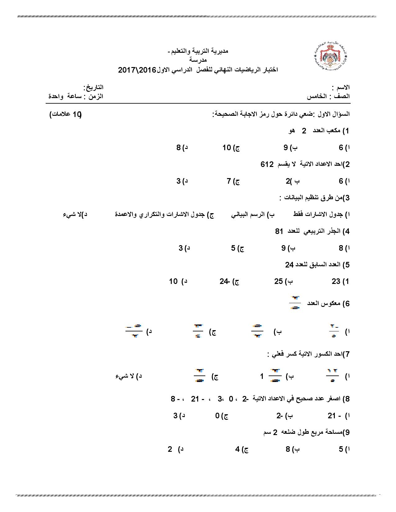 اوراق عمل للاختبار في. امتحان الرياضيات للصف الخامس نهاية الفصل الثاني 2017 2018. اسئلة اختبار مادة الرياضيات للصف الخامس الابتدائي الفصل الاول تحميل نموذج اختبار منهج رياضيات خامس ابتدائي ف1 للعام الدراسي 1441 على موقع واجباتي عرض مباشر وتحميل ويشمل على النماذج التالي اختبار الفترة الاولى رياضيات. اختبار مادة الرياضيات للصف الخامس الابتدائي الفصل الدراسي الثاني تحميل نموذج اختبار منهج رياضيات خامس ابتدائي ف2 للعام 1441 على موقع واجباتي عرض مباشر وتحميل pdf و word ويشمل اختبار الرياضيات خامس على النماذج التالية.
