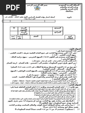اسئلة اختبار مهارات البحث ومصادر المعلومات ثاني ثانوي