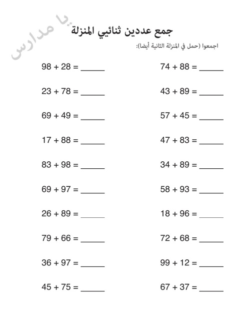 ورقة عمل جمع الصف الثاني رياضيات الفصل الثاني المناهج السعودية